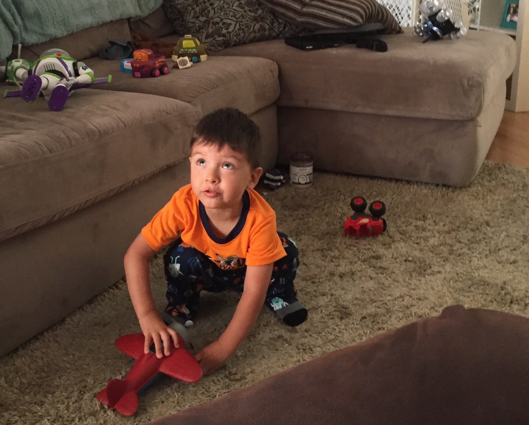 Lucas is super into playing with his character toys while watching the corresponding movies or tv shows. He’ll play with his Lightning McQueen while watching Cars, he’ll play with his airplanes while watching Planes, etc. Hell hath no fury like a toddler who’s mom can’t find the right toy.