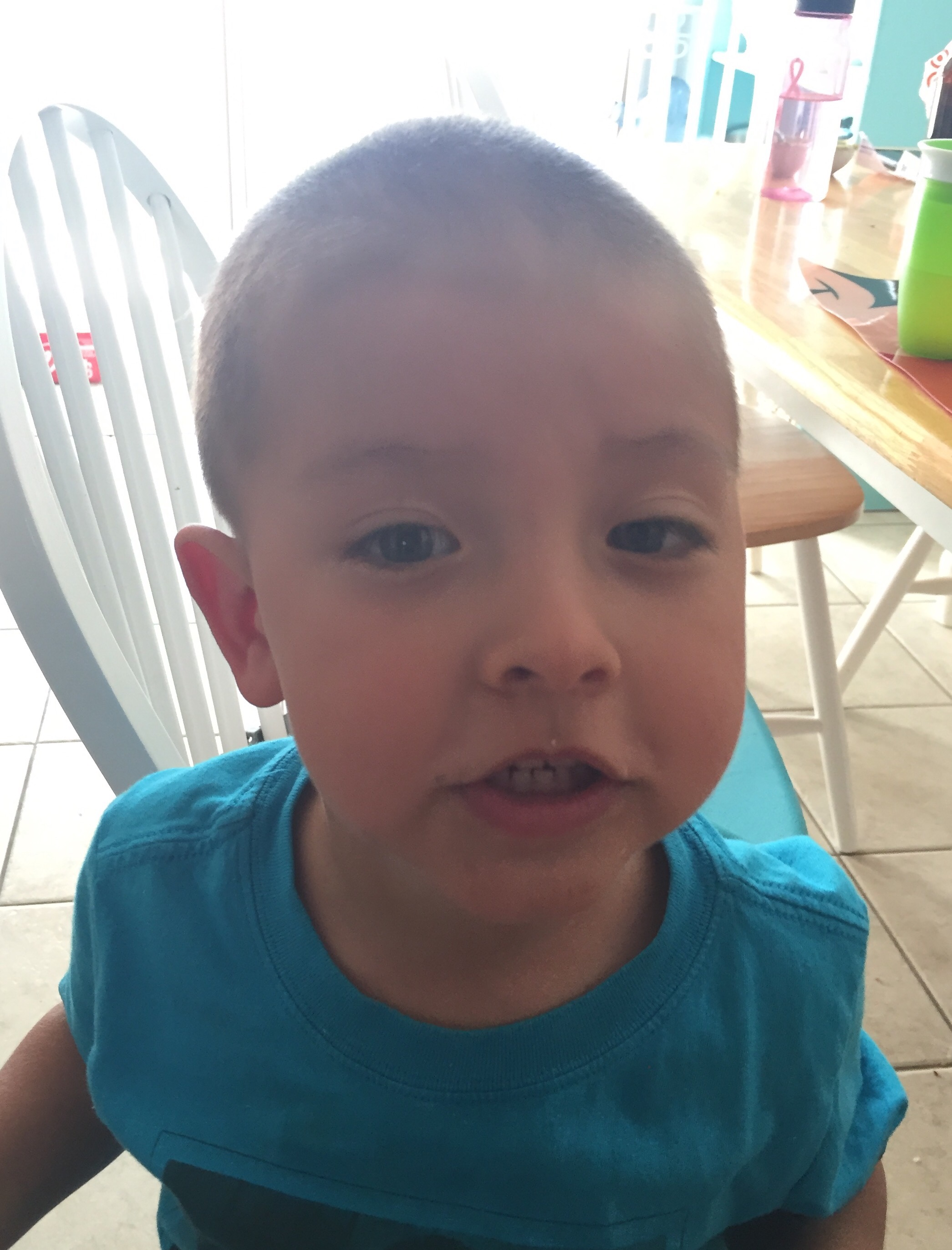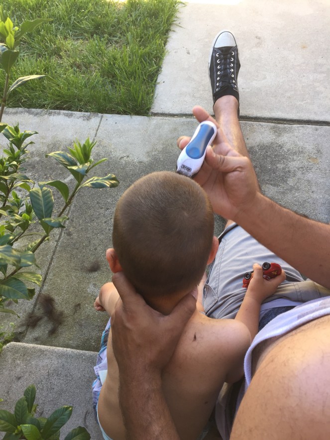 David surprised me when he defiled Lucas’s hair over the weekend. For months he’d been saying Lucas’s hair should be short for the warm weather, due to him being so hot blooded and sweating profusely whenever it’s warm or he’s running around, which is all. The. Time. To say that I was hesitant is an understatement. Anything pertaining to Lucas growing into a big boy makes my heart ache. Although I love each new milestone and am filled with pride at each new accomplishment, I still see the six pounds, six ounces, 20 inch miracle I met 29 months ago. So anyway, while I was nursing Talia, David asked me to take a “before shot of Lucas.” As I was distracted, I replied, “a what now?” And he said, “never mind, I’ll do it.” And proceeded to take my teeny-tiny-itty-bitty baby boy outside. A few minutes later I heard a buzzing sound, and went to investigate, and low and behold, Lucas’s hair was all over the ground. Wtf?