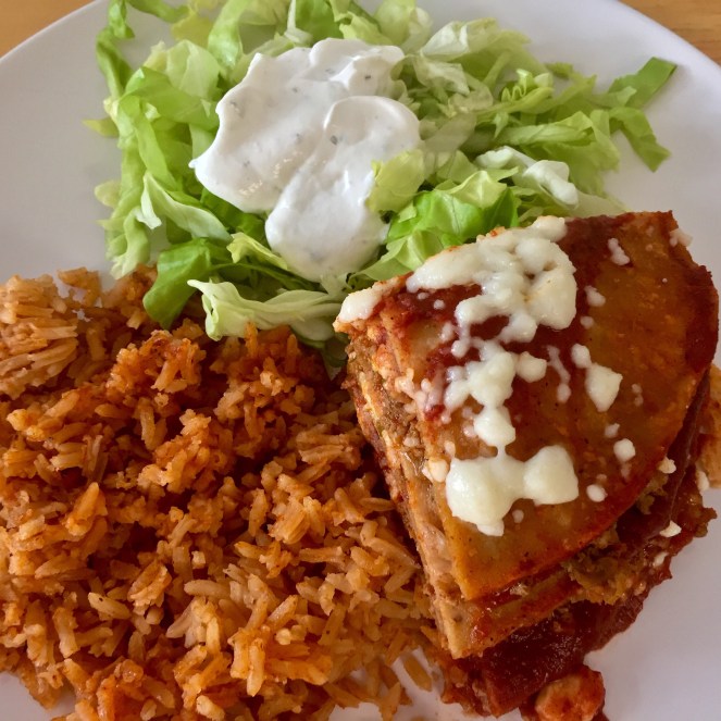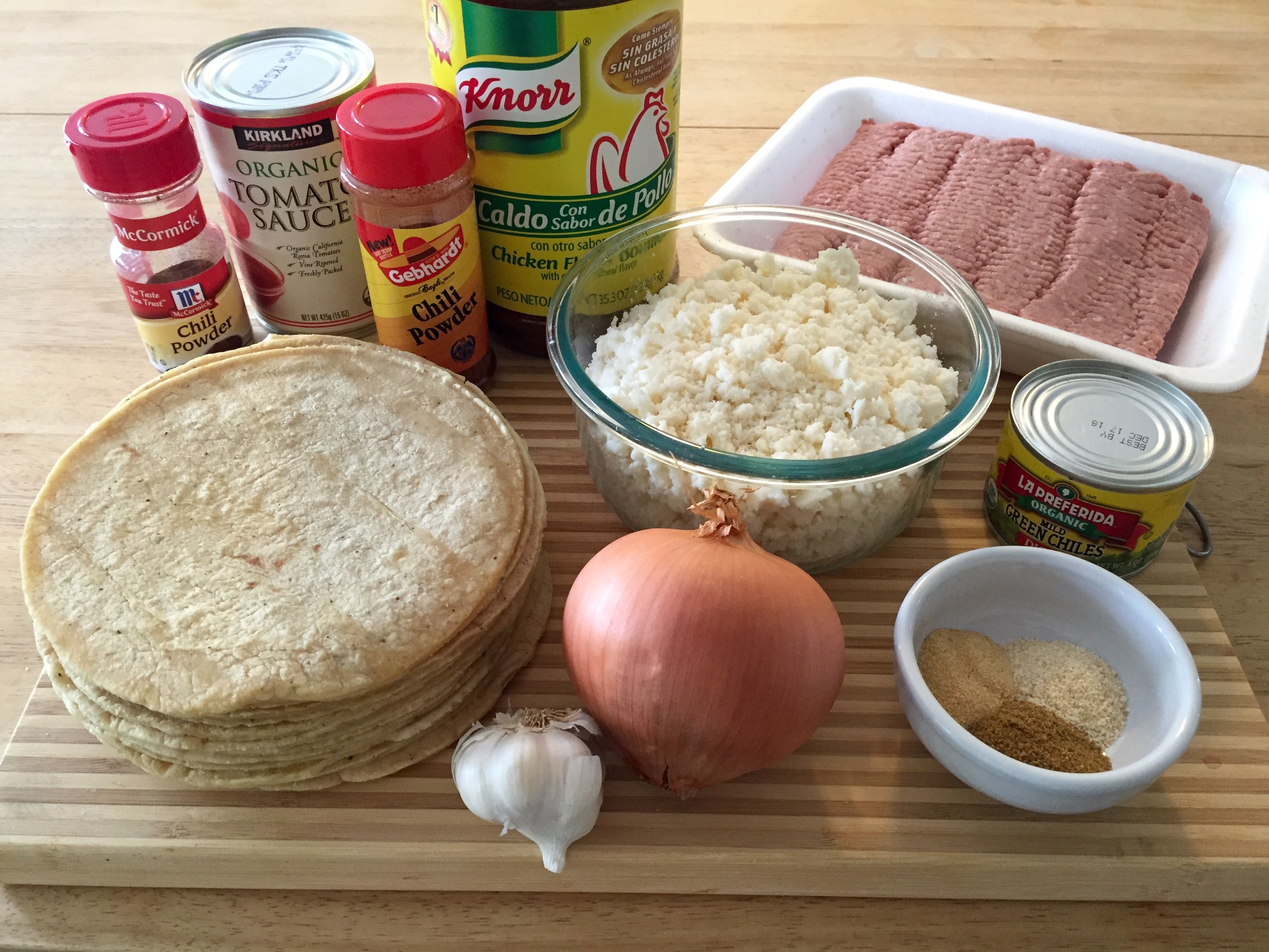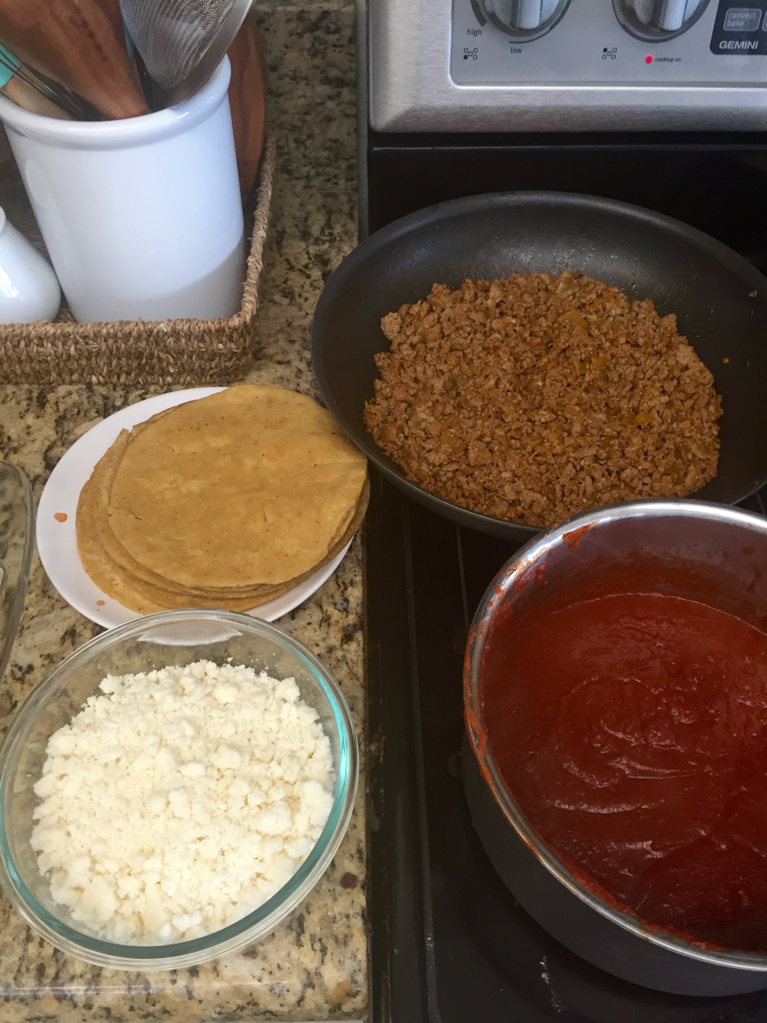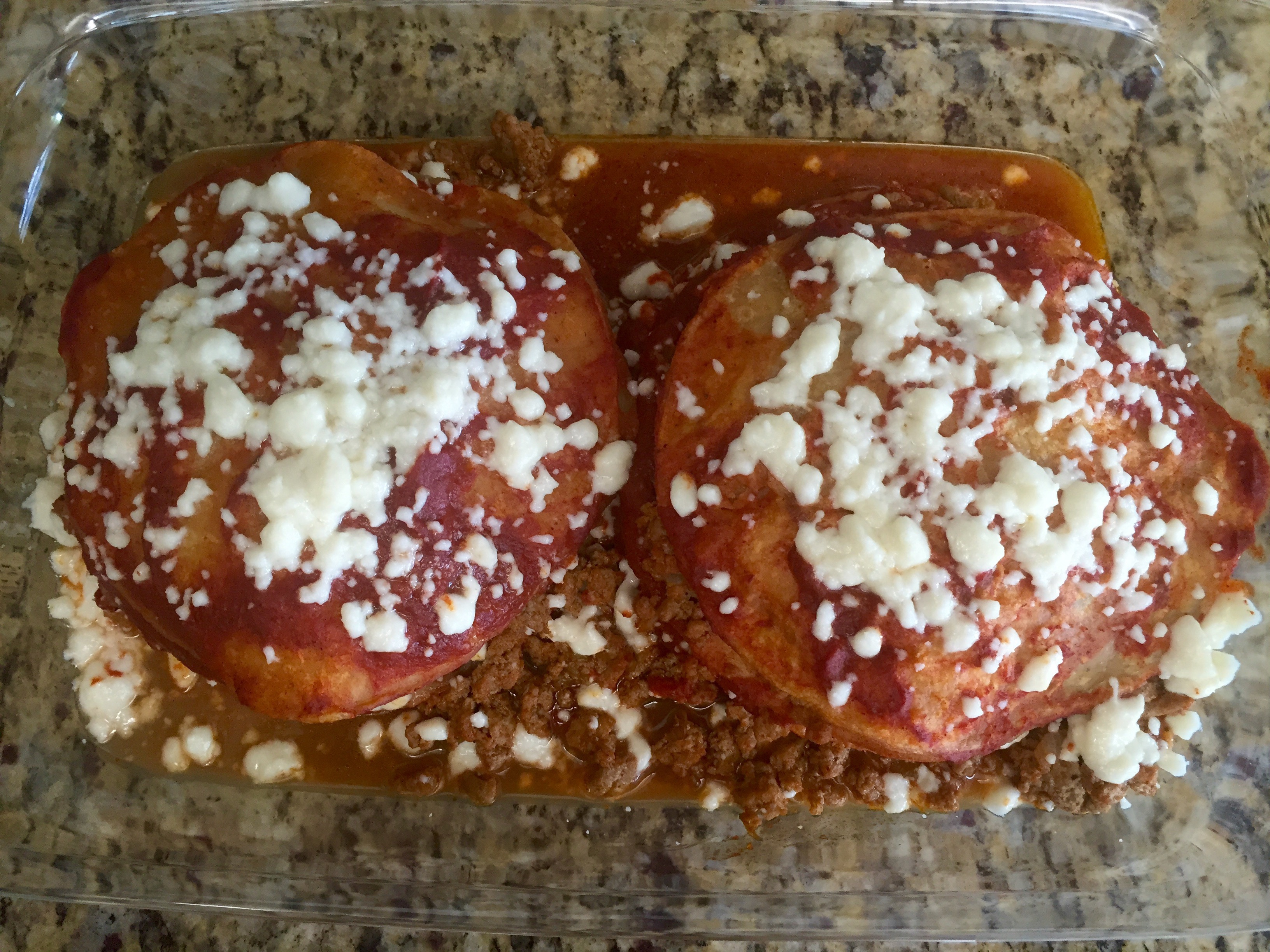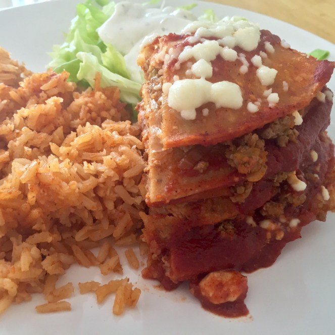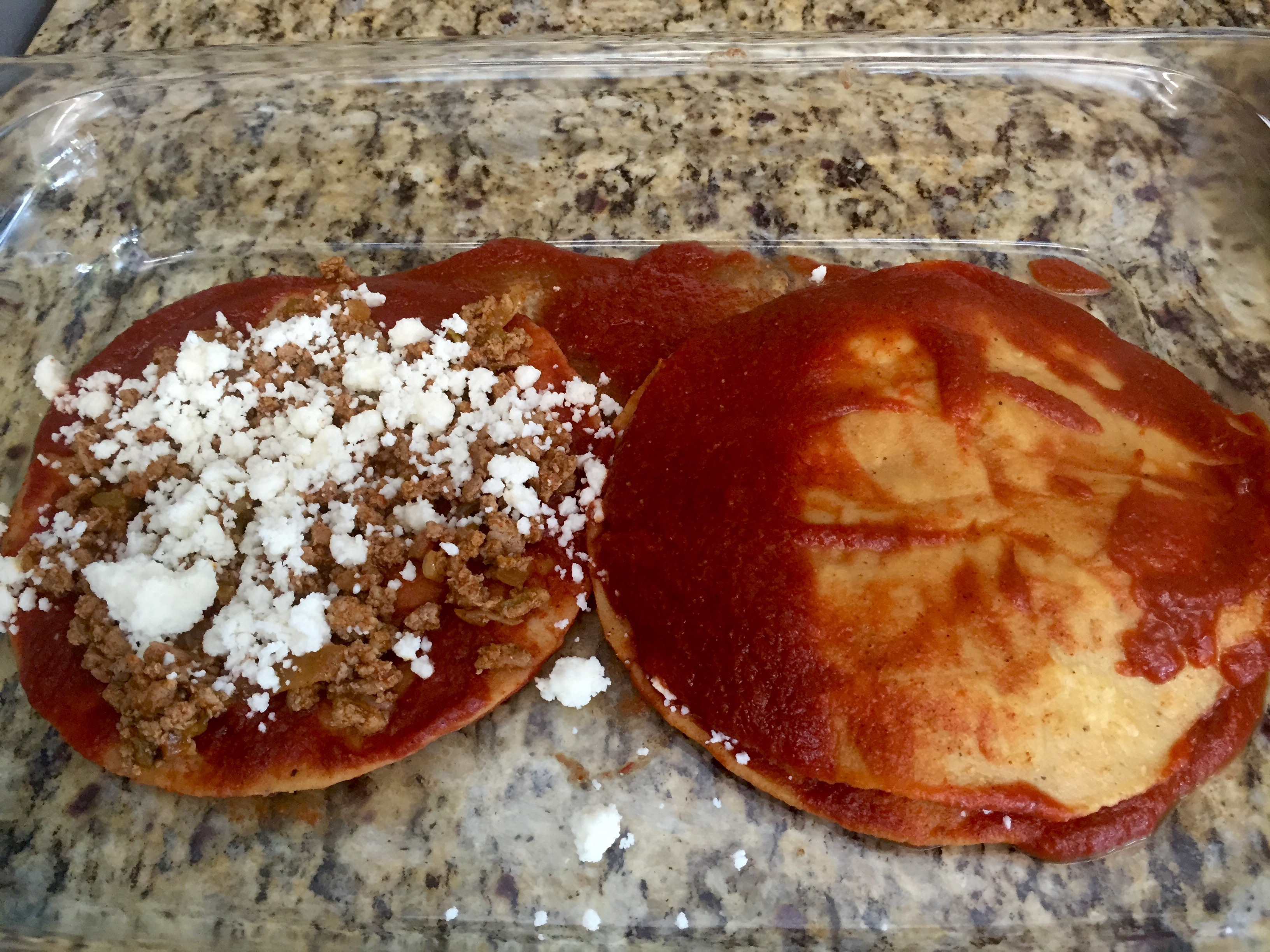 Now as much as sopa de arroz is near and dear to my heart, it isn’t a super substantial meal. The second recipe I’m sharing is enchiladas tapas. My mom’s best friend taught me this one when I was in middle school. She knew I was the main cook in our home, and one day I was telling her how I loved enchiladas but hated how my fingers stung from rolling the hot salsa dipped tortillas. She told me she’d teach me an easier way, and this was the base recipe for my enchiladas tapas.
