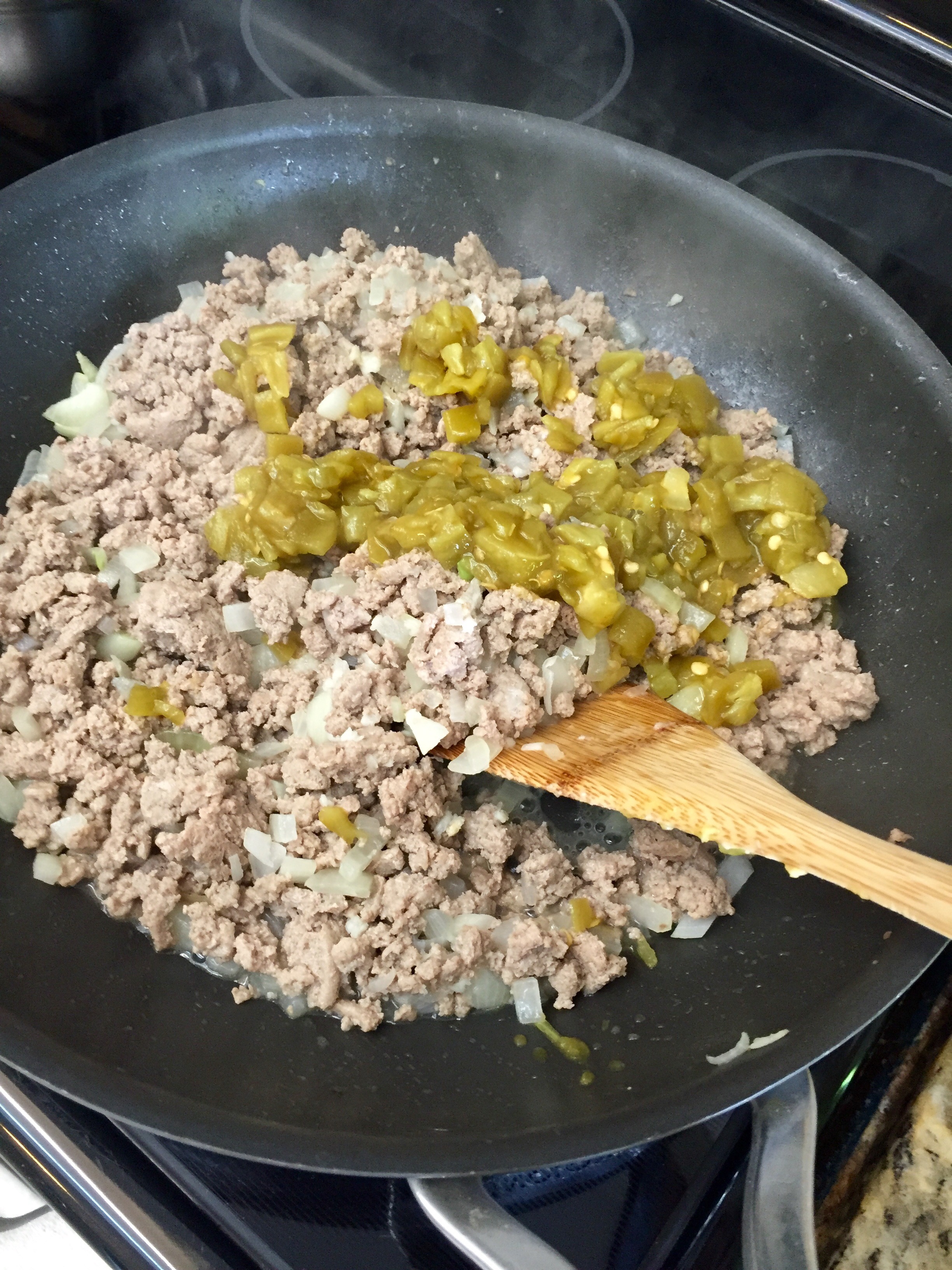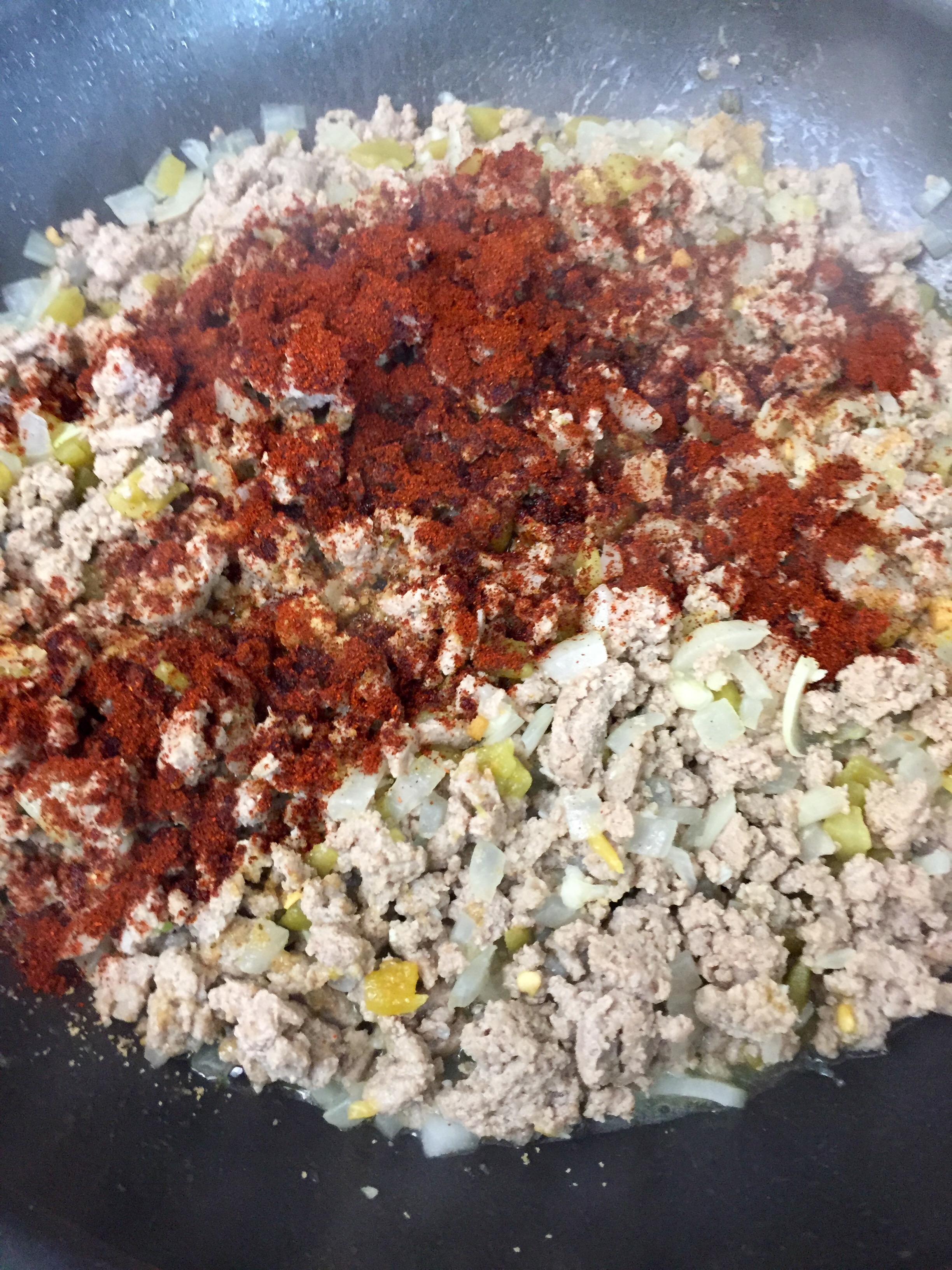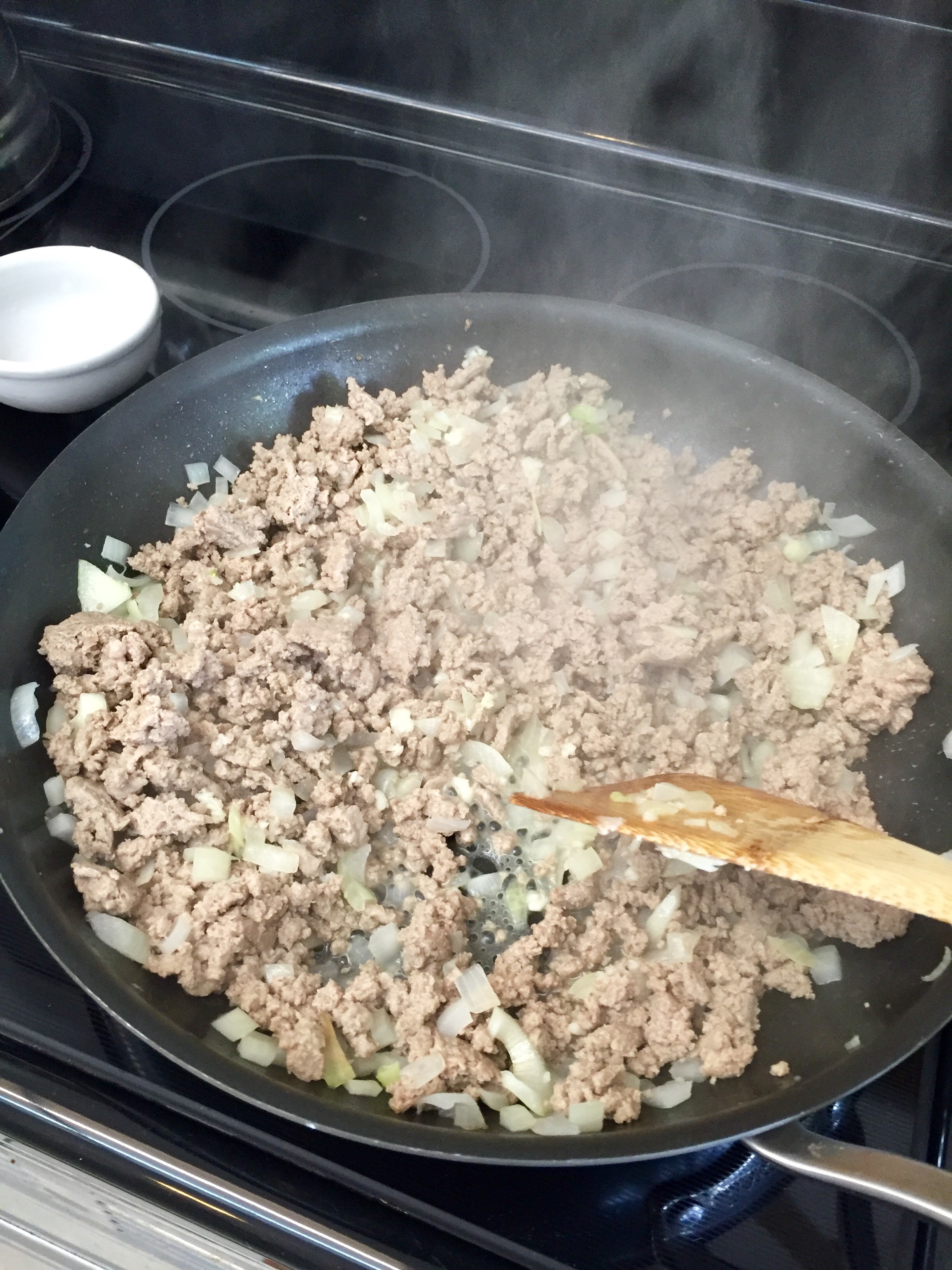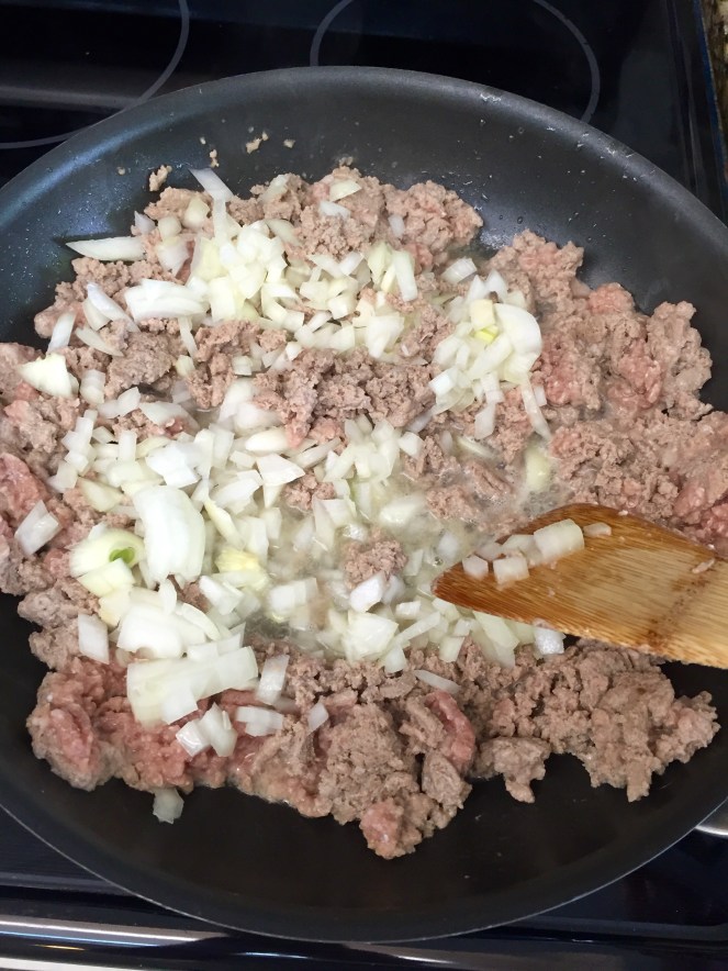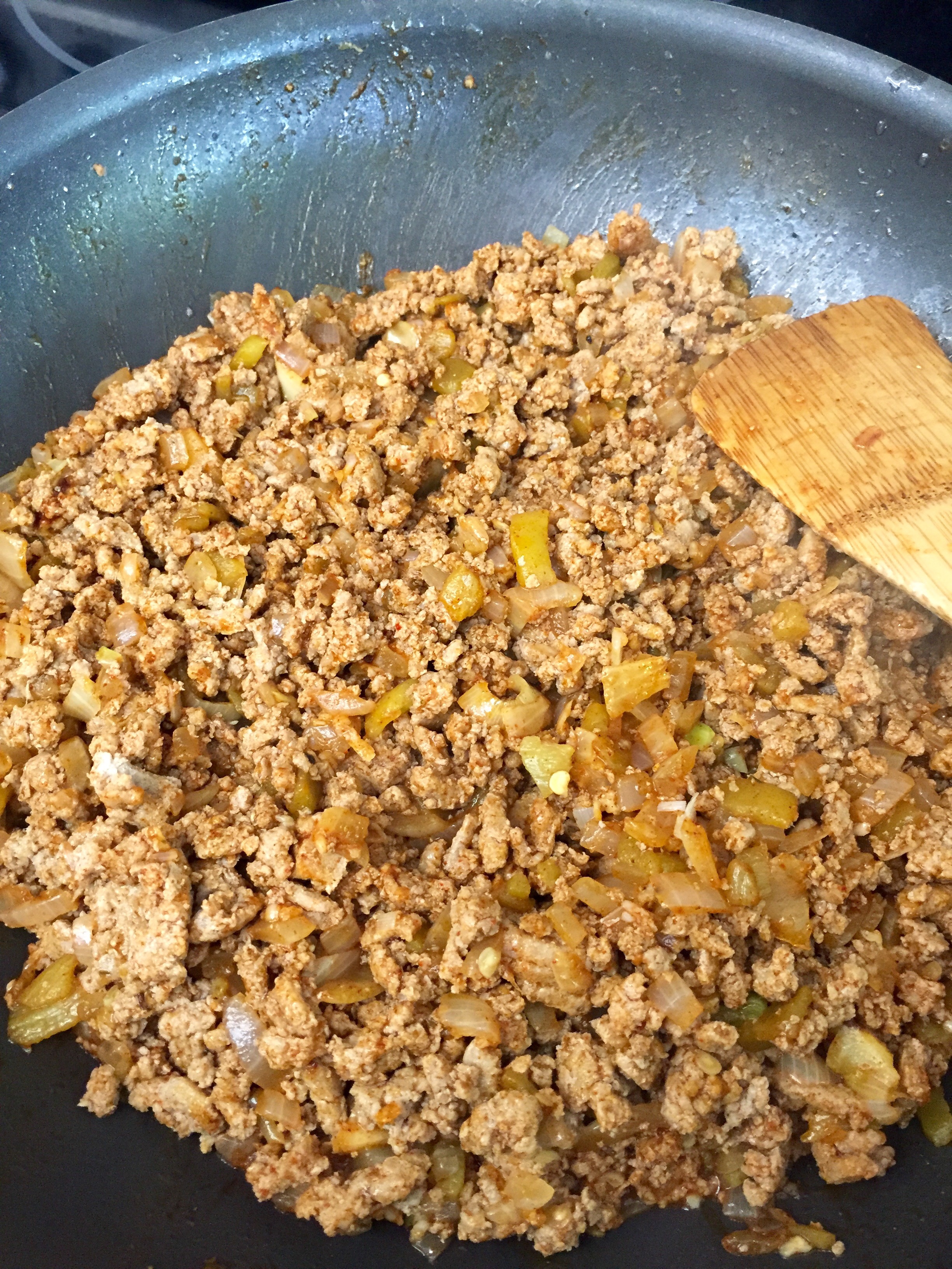 Begin by heating 2 tbs. oil in pan and add ground turkey. Once the turkey begins to brown add the diced onions and continue to brown until onions are translucent.
