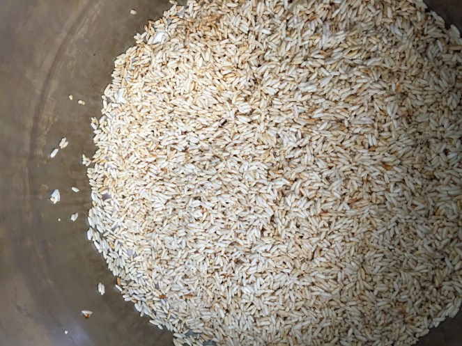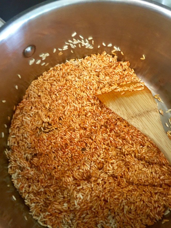 Continue to move rice around pan as it toasts. The key to Mexican rice is toasting the rice without burning it. KEEP IT MOVING. If it is browning too quickly, reduce the heat and KEEP IT MOVING. I actually find the sound of the stirring rice relaxing, chickah-chickah- chickah. Once the rice is welll browned, it releases a sweet aroma.