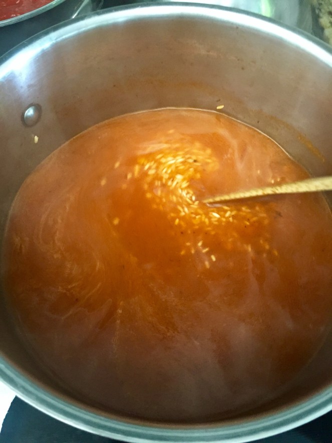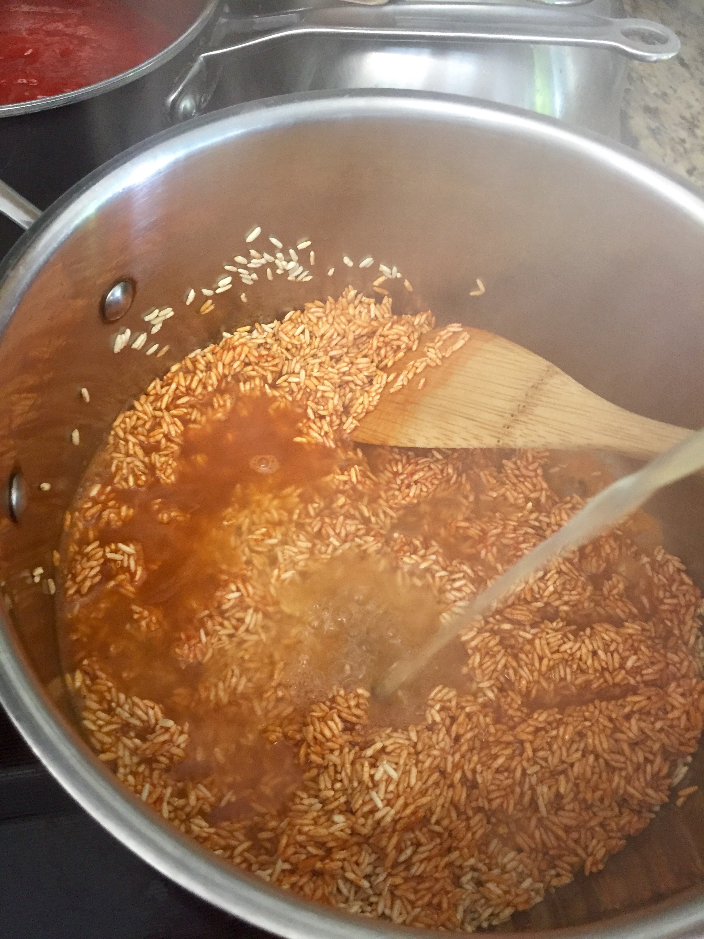 Next you add the tomato sauce. I always remove the rice from the heat to add the sauce because it will bubble up and splatter. Once the rice is coated, return to medium heat.
