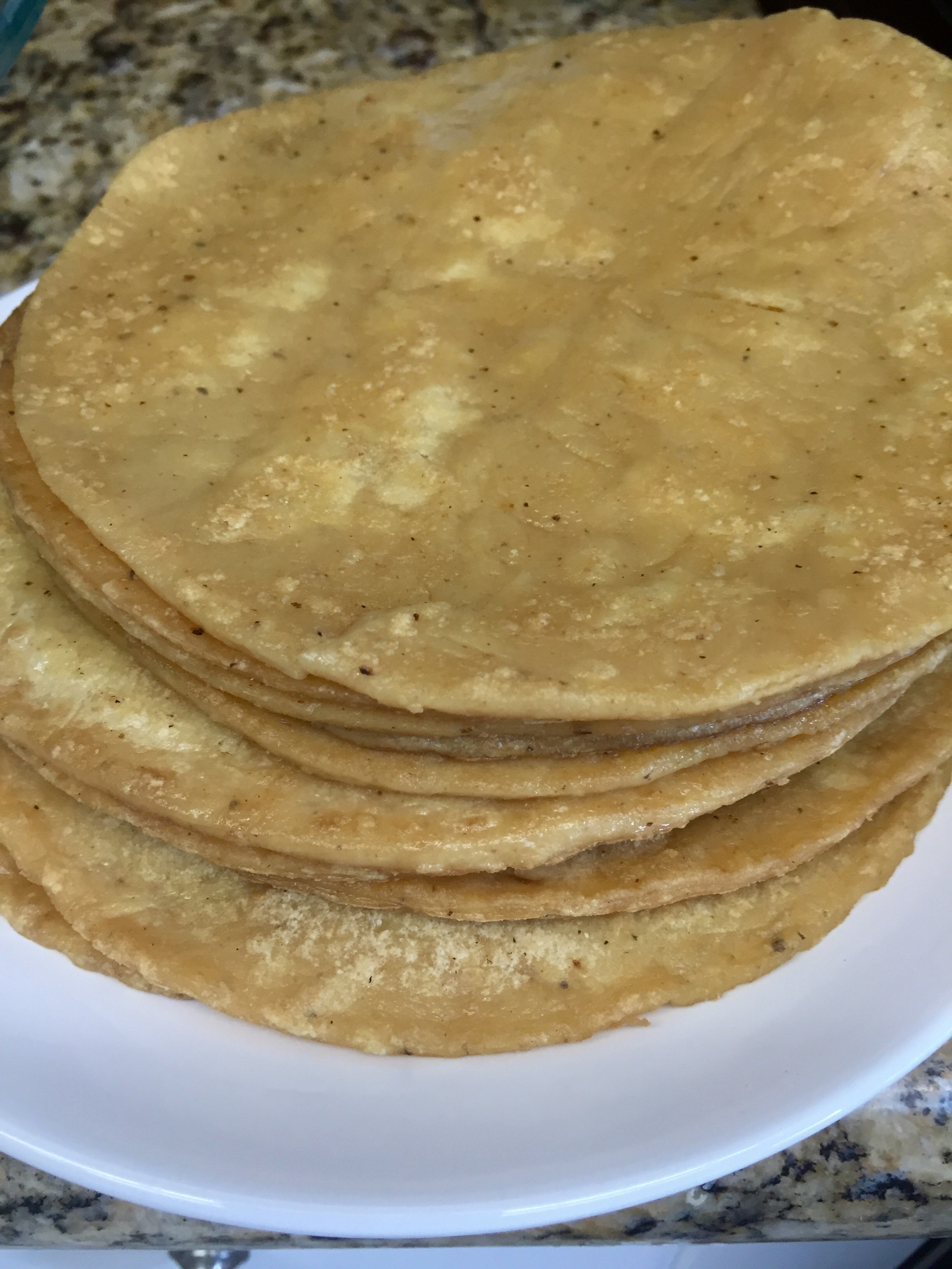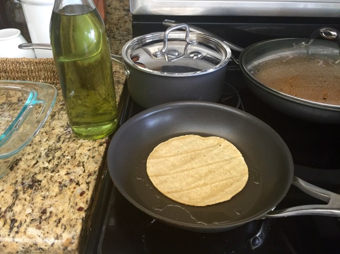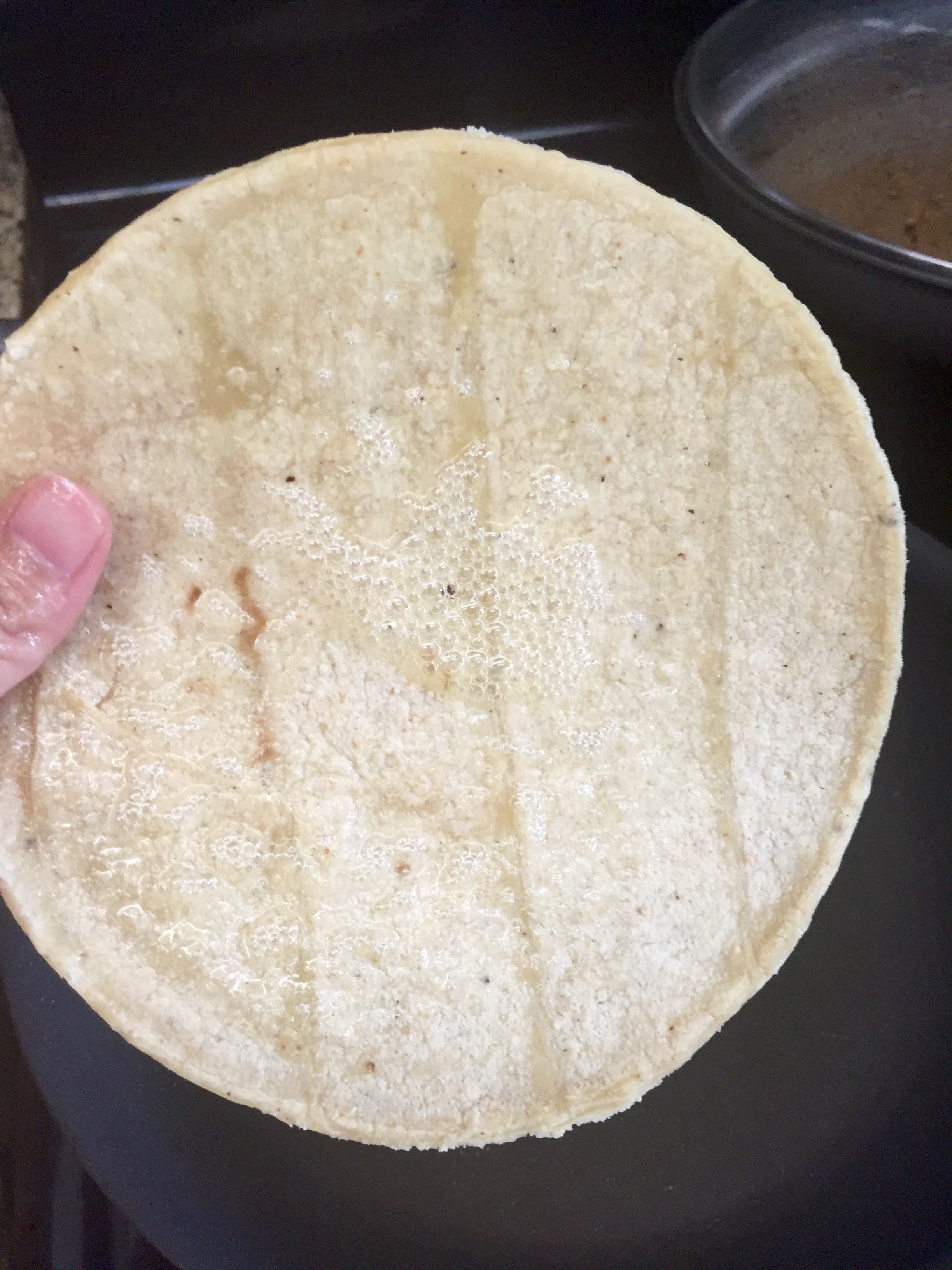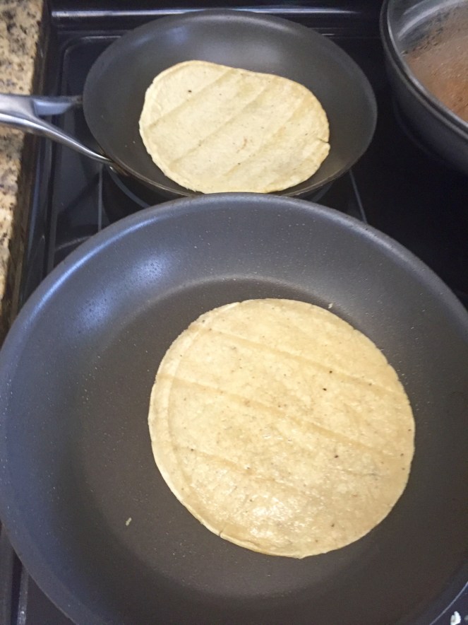 This is the most tedious part of making enchiladas, to finish quickly, I use two pans at a time. Oil, tortilla down, flip, repeat until browned.