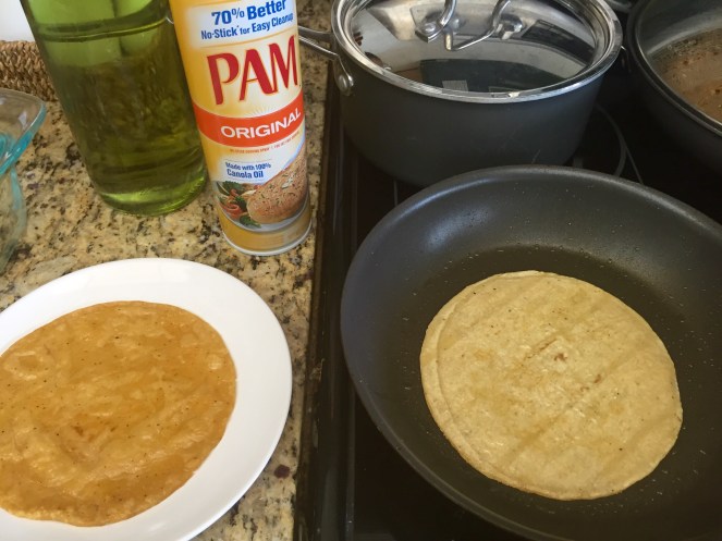 OR you can use Pam cooking spray, which is what I do to make it go faster. Spray the pan, place tortilla in, spray back of tortilla.