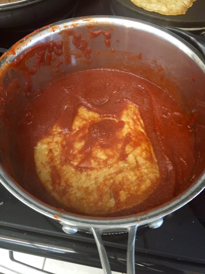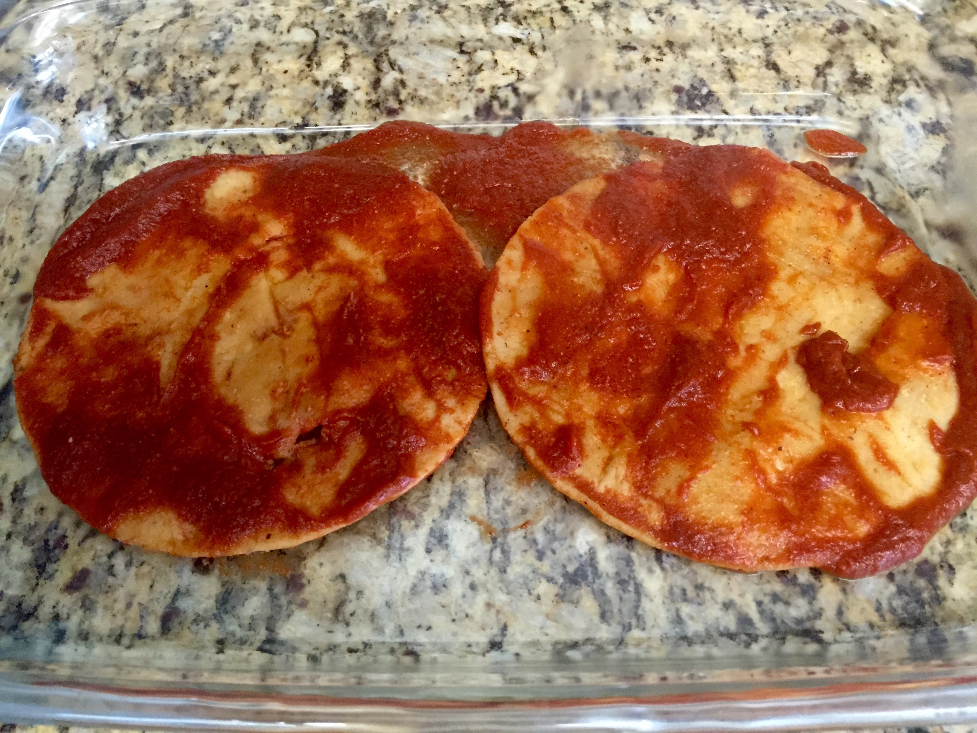 Once you have all your tortillas browned, start assembling. Place one browned tortilla at a time into the sauce. Lightly coat and remove from sauce. This should be done quickly to avoid the tortillas from becoming mushy and tearing as you try to pull them out. I use a large turner/spatula.