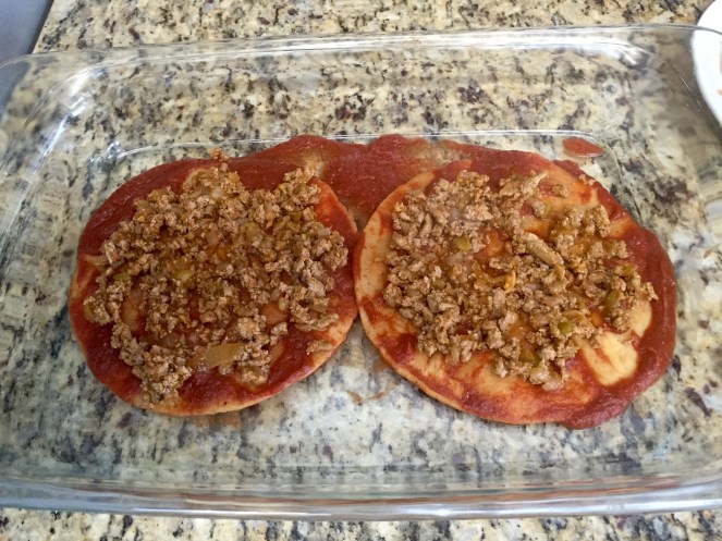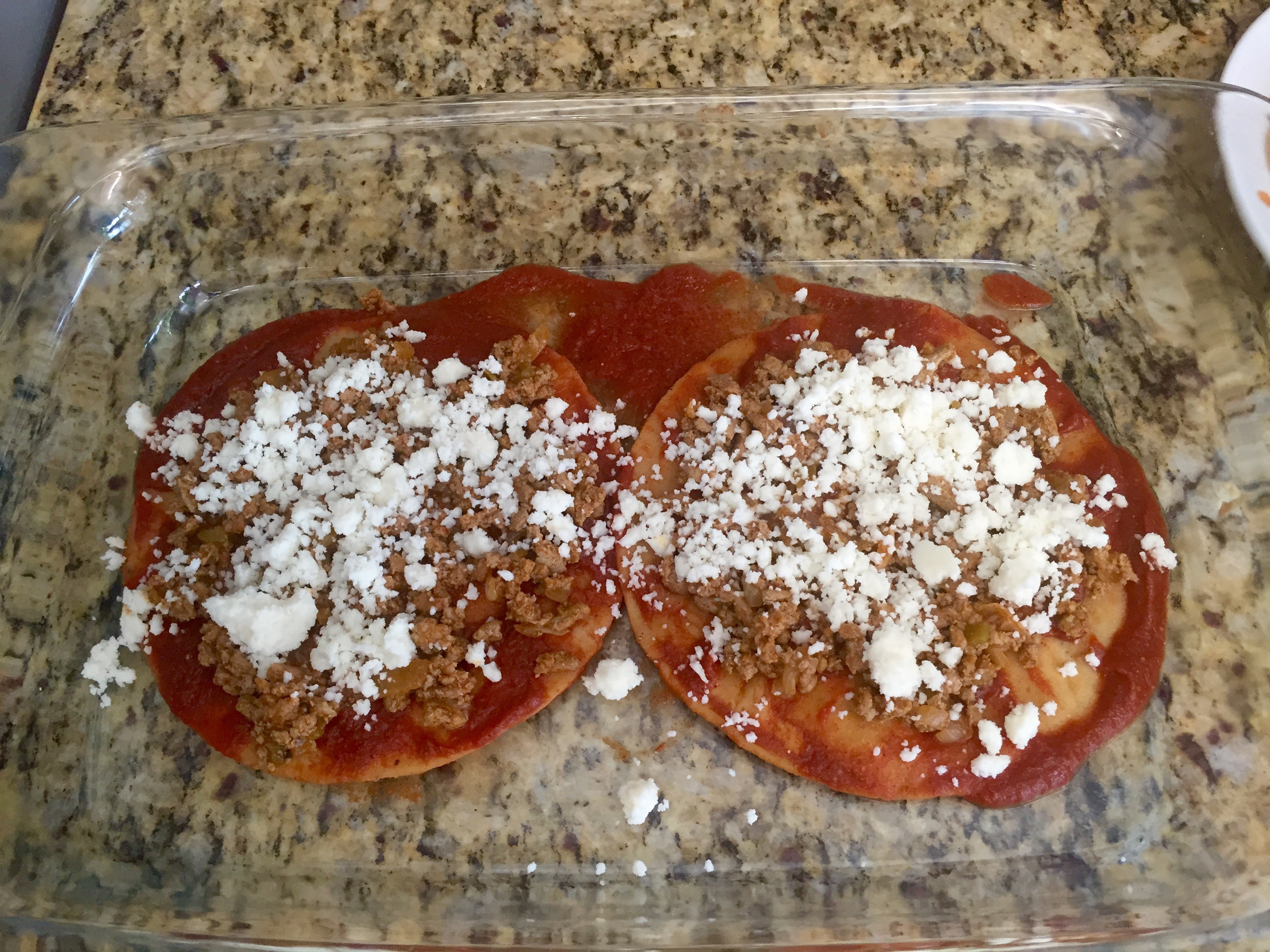 Once you have all your tortillas browned, start assembling. Place one browned tortilla at a time into the sauce. Lightly coat and remove from sauce. Place two sauce covered tortillas in a 9×13 baking dish in a single layer. Add a spoonful of the turkey mix on each tortilla, and spread evenly. Next add a handful of crumbled queso fresco, spread evenly.